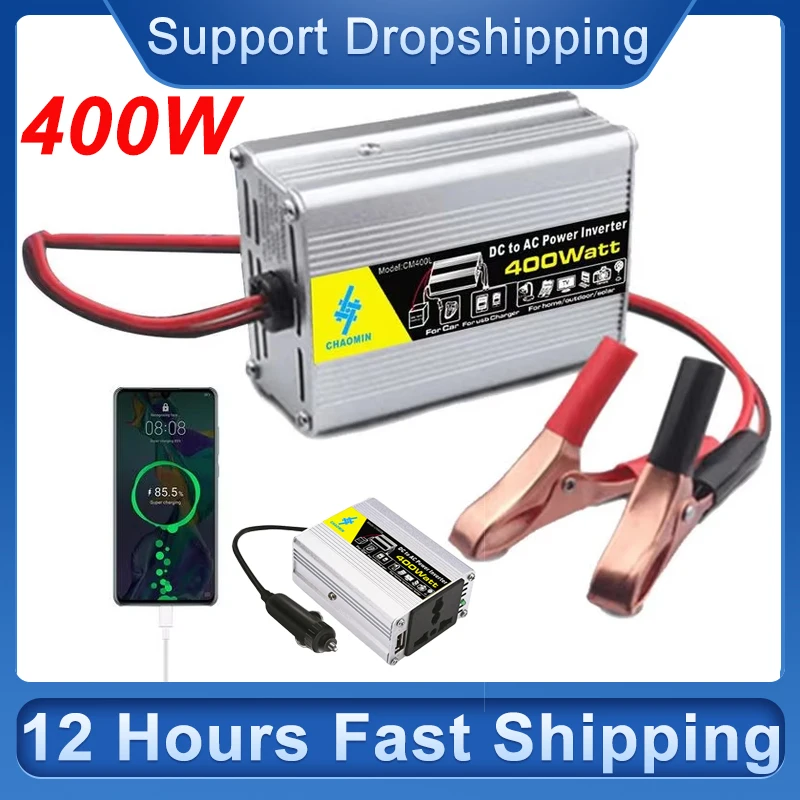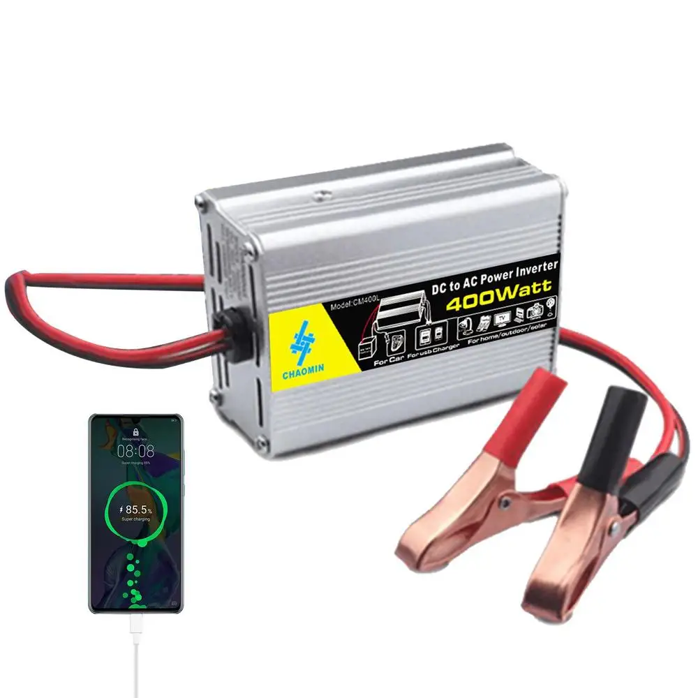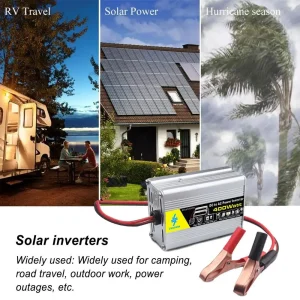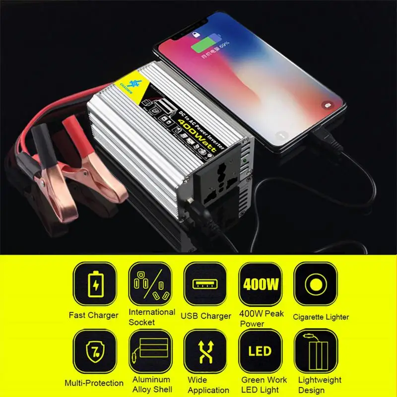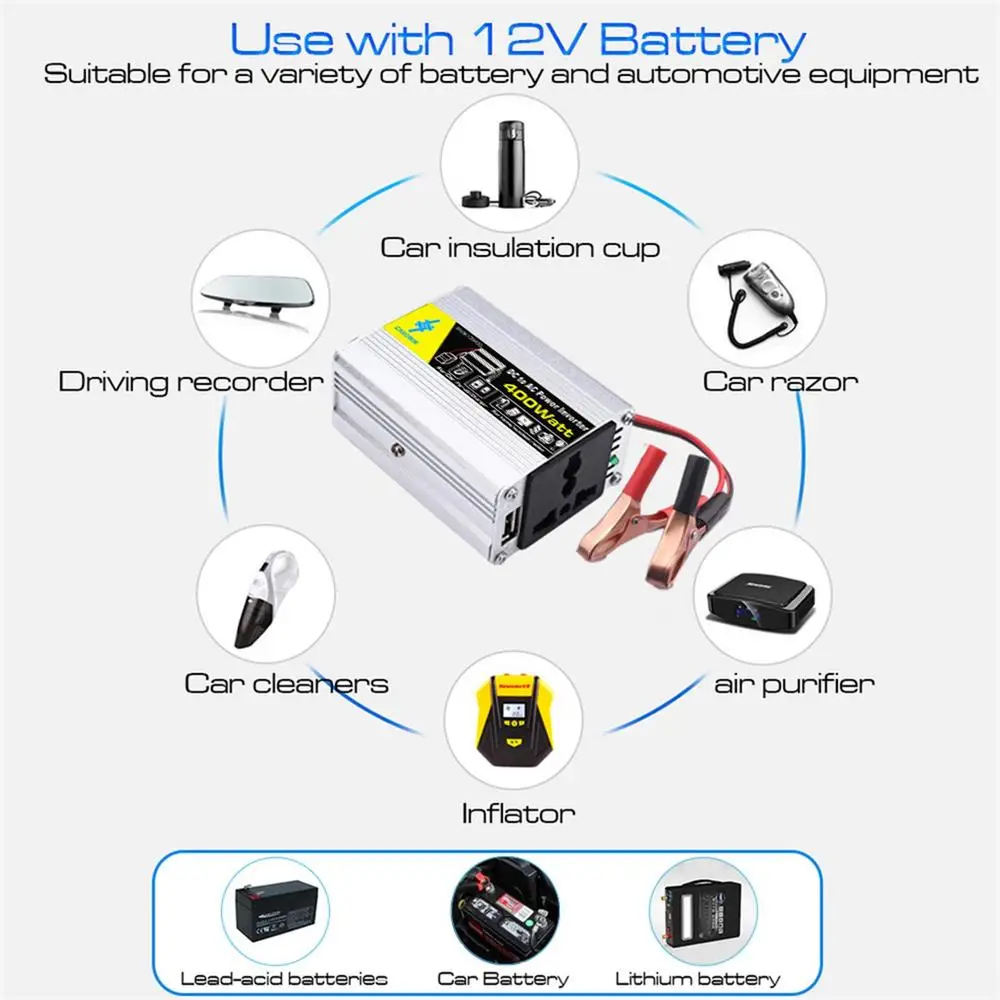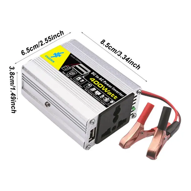 1.Reliable Power Supply: Provides 200 watts continuous power and 400 watts max power to charge your devices with stable and pure sine waves. Comes with 2 battery clips or lighter plugs for easy connection. With USB port and AC power outlet for versatile use.